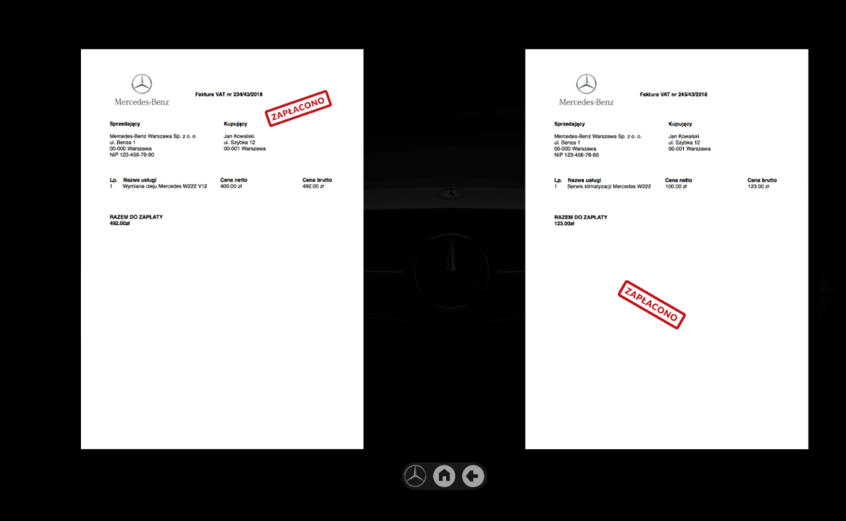 Aplikacja udostępnia dokumenty dotyczące wybranego auta klienta (w tym karty pojazdu, diagnostyki i ekspertyz technicznych, historii napraw i wymienianych części, wycen oraz faktur, reklamacji, pism i korespondencji z klientem). Aplikacja pozwala na efektowne, interaktywne przeglądanie, przesuwanie, obracanie i skalowanie dokumentów na dotykowym ekranie za pomocą dłoni.