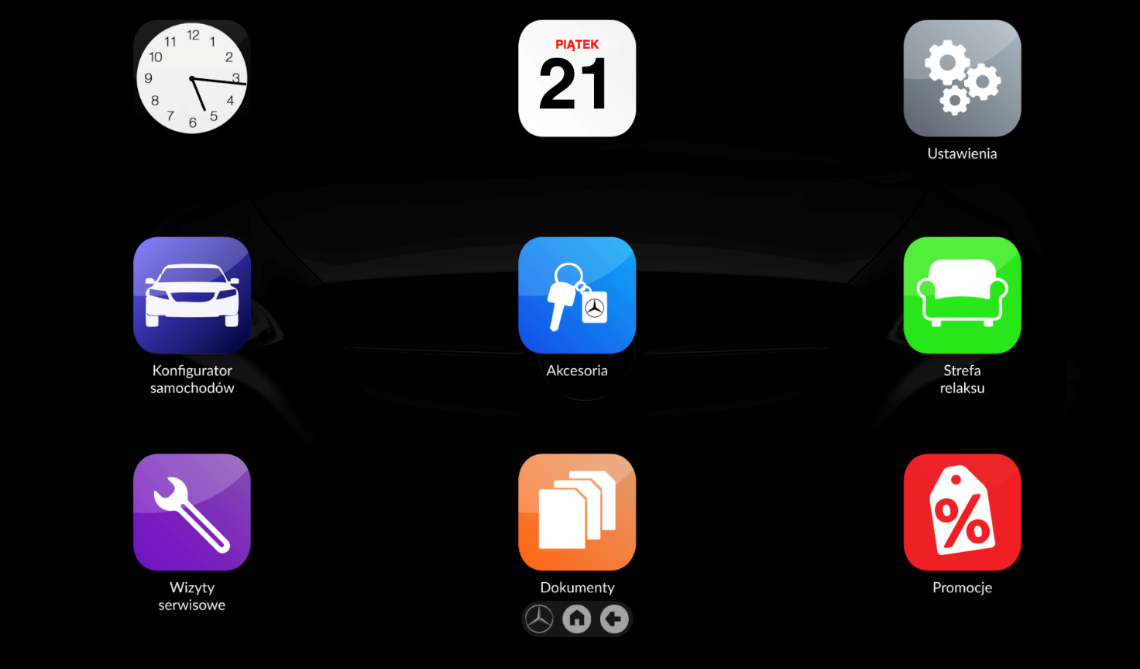 Aplikacje dostępne w strefie relaksu mają na celu zapewnienie rozrywki klientom oczekującym na obsługę przez personel salonu samochodowego, w szczególności w oczekiwaniu na odbiór nowego auta z działu sprzedaży lub auta z naprawy/przeglądu w dziale serwisu technicznego.