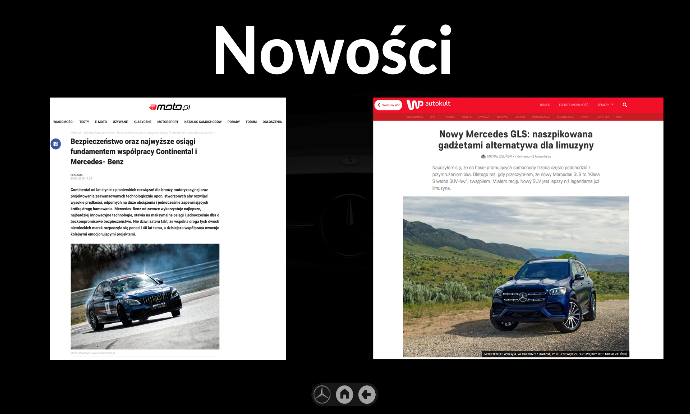 NOWOŚCI to multimedialna prezentacja zdjęć, filmów i informacji pogrupowanych tematycznie w serwisy informacyjne obejmie bieżące wydarzenia, konferencje, seminaria, premiery i nowości z branży motoryzacyjnej pełniąc dodatkowo funkcje edukacyjne, marketingowe i rozrywkowe. Aplikacja pozwala na efektowne przeglądanie, przesuwanie, obracanie i skalowanie zdjęć na dotykowym ekranie za pomocą dłoni.