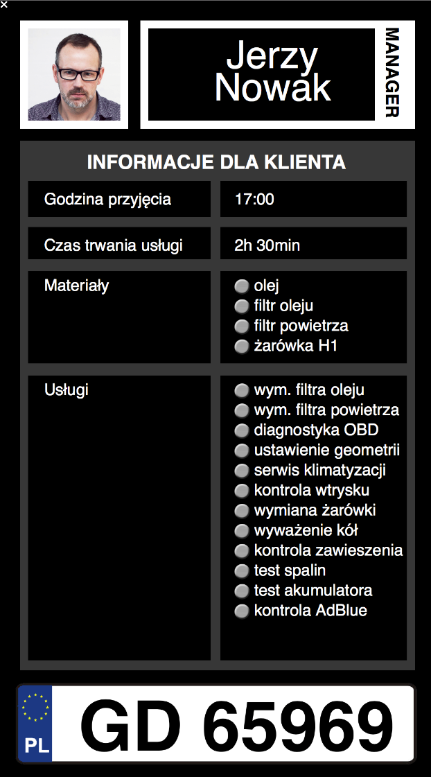 Aplikacja wyświetla na ekranie Interaktywnego Stołu LCD dzienny grafik i status usług zleconych przez klienta w serwisie technicznym salonu samochodowego. Wyświetlane numery tablic rejestracyjnych informują o kolejności i planowanej godzinie przyjmowanych aut do serwisu, bieżącym statusie realizowanej usługi, gotowości do wydania auta klientowi po zakończeniu zleconej usługi. Informacje dotyczące opiekuna klienta, czasu trwania usługi, listy wykonanych prac i użytych materiałów/podzespołów dostępne są przy użyciu funkcji dotykowych interaktywnego ekranu. Aplikacja dostępna jest również na ekranie Interaktywnego Totemu LCD stanowiącego istotny element projektowanego Systemu.