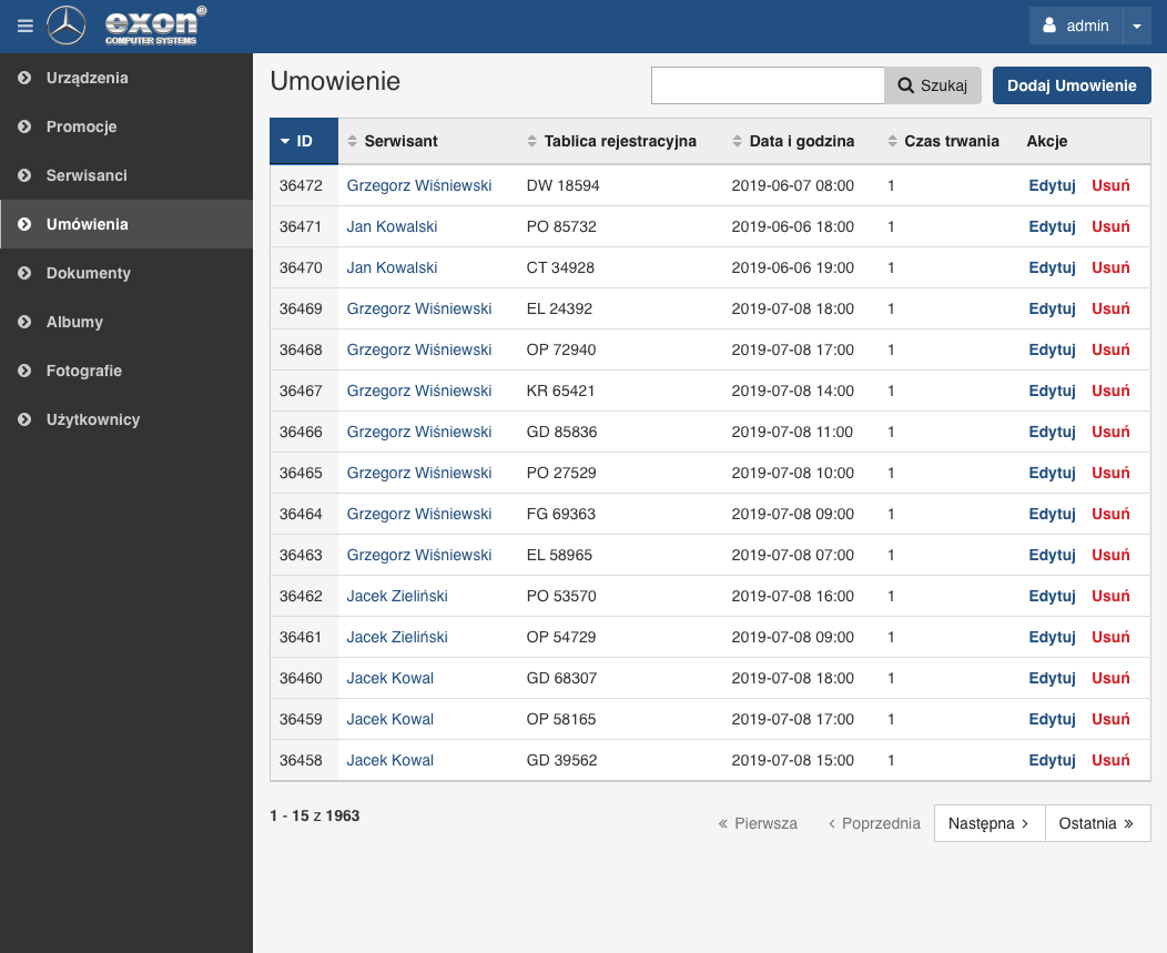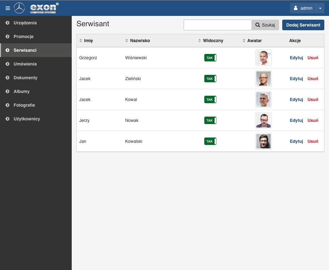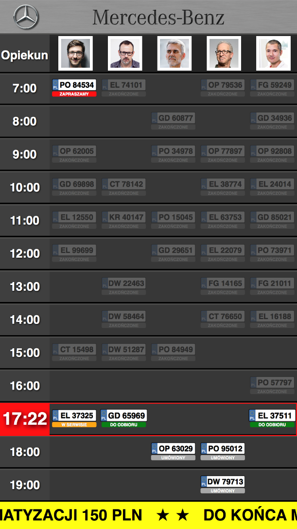 Aplikacja ma na celu wyświetlanie na ekranie interaktywnego Totemu LCD dzienny grafik i status usług zleconych przez klienta w serwisie technicznym salonu samochodowego. Wyświetlane numery tablic rejestracyjnych będą informować o kolejności i planowanej godzinie przyjmowanych aut do serwisu, bieżącym statusie realizowanej usługi, gotowości do wydania auta klientowi po zakończeniu zleconej usługi. Informacje dotyczące opiekuna klienta, czasu trwania usługi, listy wykonanych prac i użytych materiałów/podzespołów dostępne będą przy użyciu funkcji dotykowych interaktywnego ekranu. Zarządzanie i administrowanie zleceniami serwisowymi będzie realizowane z poziomu Panelu Administracyjnego Systemu.